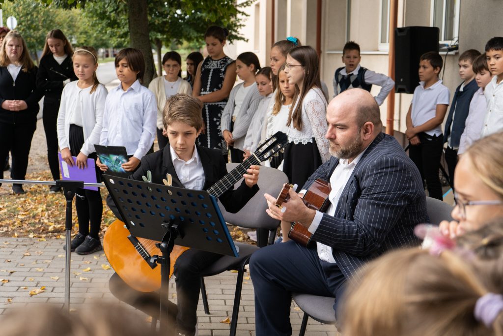 „A Zenei Világnap azt üzeni nekünk: minden ember életében ott a helye a dallamnak és a ritmusnak.” E sorokat követően iskolánk énekkara adta elő a „Szánt a babám” című magyar népdalt Korponai Zsolt gitár kíséretével és gyönyörködhettünk Zombori Benjamin és Korponai Zsolt gitárduójának játékában. Szokolay Sándor Dudanótáját játszották el.