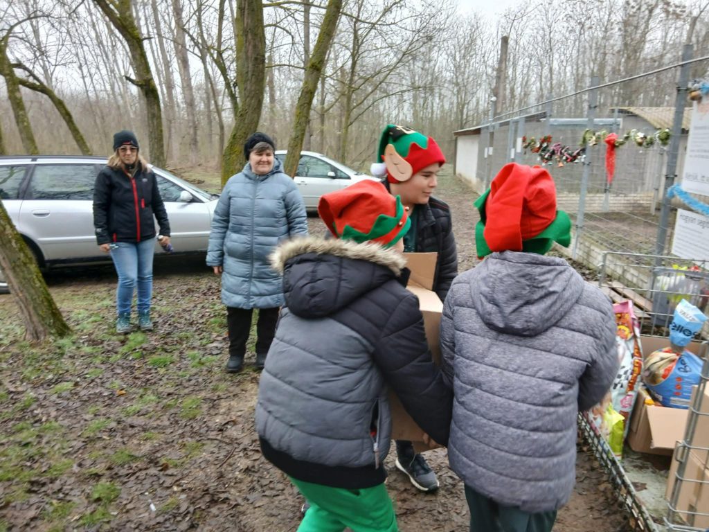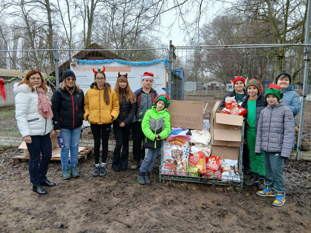 Iskolánkban hagyománnyá vált, hogy december elejétől Adventi kihívásokat szervezünk, melyek során a tanulók nap, mint nap különféle feladatokat vállalnak és teljesítenek. Idén december 4-én, a Tappancs napon az adománygyűjtés is része volt kihívásoknak. Ezen a napon szinte megduplázódott a felajánlások mennyisége, melyek kiszállítására december 11-én került sor. Tanítványaink hét képviselője stílusosan beöltözve, a Télapó manóiként adták át a kisállatoknak szánt karácsonyi ajándékot. A menhelyen körbevezettek bennünket, bemutatták a cicusok lakhelyét és a kutyák kenneljeit.  Megtekintettük a  karanténházat, amelynek a lényege , hogy ebben az elkülönített épületben az  újonnan érkezett kisállatokat megfigyelik, megvédik a fertőzésektől, amíg ki nem vizsgálják és be nem oltják, hogy megelőzzék a betegségek terjedését. Megtudtuk, hogy naponta kb. 70 kg kutyatápot fogyasztanak el az állatok, a menhely jelenlegi létszáma pedig 200 kutya és mintegy 50 macska.  Az alapítvány egyik munkatársa hangsúlyozta, hogy minden segítség rendkívül sokat jelent a gazdátlan állatok számára, hiszen – ahogy fogalmazott – „sok kicsi sokra megy”.