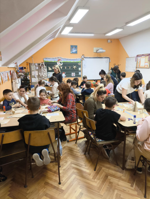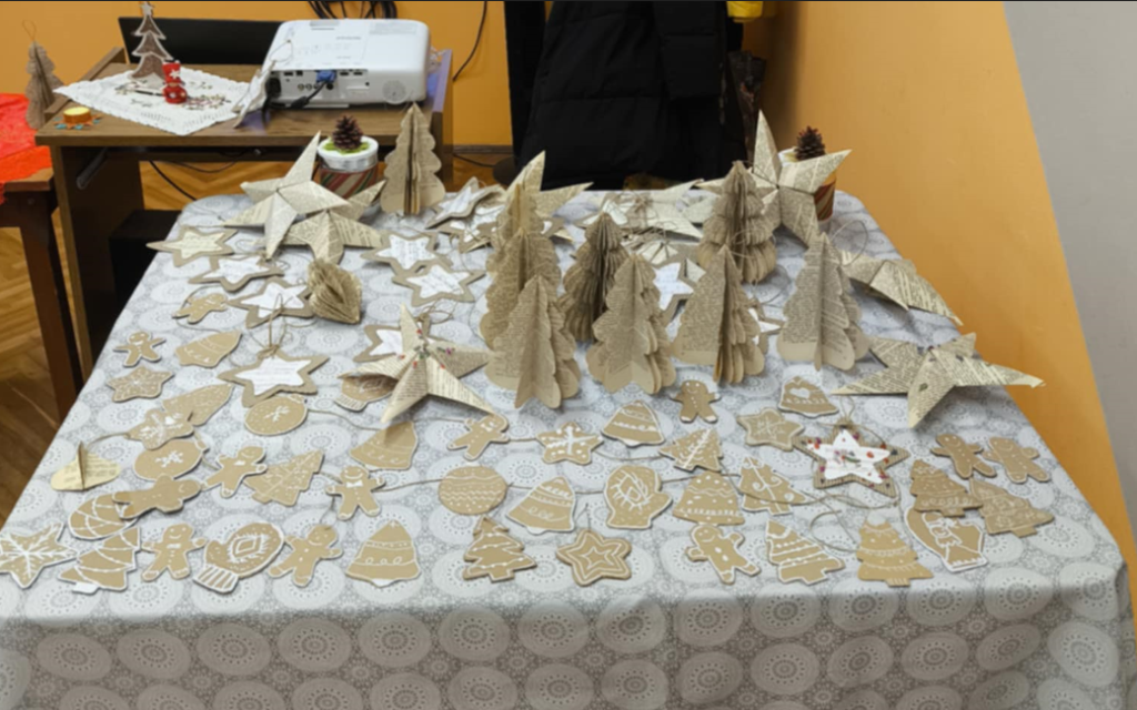 A gyerekek nagyon örültek neki, hogy szüleik, nagyszüleik is részt vehettek ezen a kézműves délutánon és együtt alkothattak különböző technikákkal szebbnél szebb díszeket. Készültek például régi könyvlapokból, többféle kartonból és régi kották felhasználásával csillagok, gömbök és mézeskalács formák. A formák megrajzolását, díszítését élvezték a gyerekek talán a legjobban. A közös munka igazán ünnepi, családias hangulatban telt karácsonyi dalokat hallgatva, énekelve.