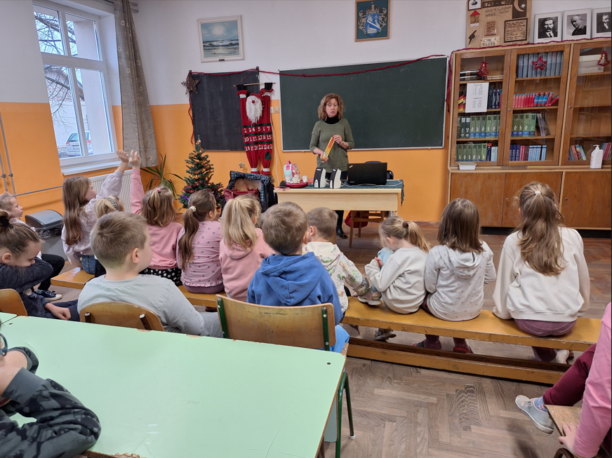 December 12-én délelőtt az első osztályosok izgalmas látogatást tettek az iskolai könyvtárban, ahol egy karácsonyi ünnepkörhöz kapcsolódó, élményekben gazdag foglalkozáson vettek részt. Kati néni egy beszélgetéssel indította az órát, ahol a gyerekek sorra vették a karácsonyhoz kapcsolódó kellékeket, dekorációkat, felidézték a csillogó díszeket, az illatos fenyőágakat és természetesen a mézeskalácsot is.
