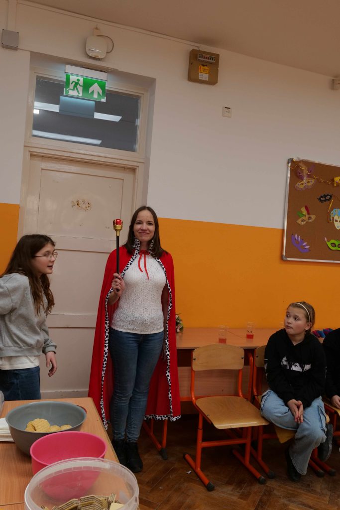 A program során, mint osztályfőnök jelképes farsangi szerepben, az „osztály királynőjeként” vett részt az eseményen, palást és jogar viselésével, amely pozitívan járult hozzá a rendezvény hangulatához és motiváló jellegéhez.